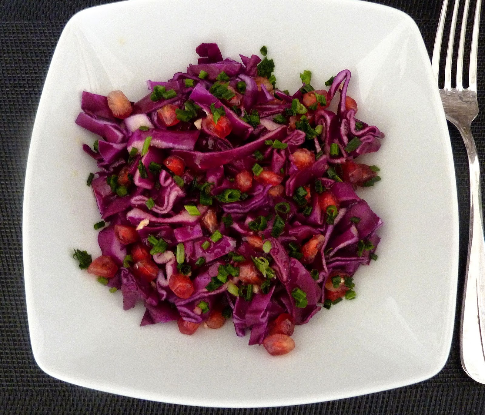- "Gustativement parlant", j'ai beaucoup apprécié cette recette : le goût fort du chou cru contraste avec la saveur sucrée des grains de grenade... Lorsque je referai cette recette, je remplacerai, sans doute, le vinaigre de cidre par du vinaigre balsamique pour adoucir encore davantage cette préparation ...